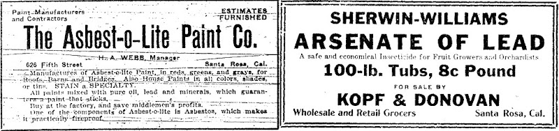 Oh, the good ol’ days, when someone could shop downtown for large containers of lethal poisons. Painting your house? In 1912 you could stop by the Asbest-o-Lite Paint Company on Fifth street and pick up a few gallons direct from the factory. And doesn’t everybody love the smell of fresh paint? Take a good whiff while they mix your color! And if it’s spring, don’t forget to spray your fruit trees with lead arsenic, that safe and economical insecticide.