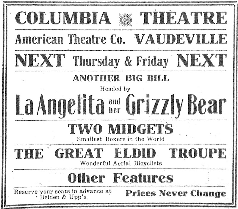 Great scott, did a 1911 vaudeville act really include a live grizzly bear? All sorts of trained animal acts appeared on stage in Santa Rosa: Dogs, monkeys, even goats. But even when raised from a cub by humans, grizzlies are famously temperamental – goddesses know what might happen if one was frightened or angered by rowdy drunks in the audience.