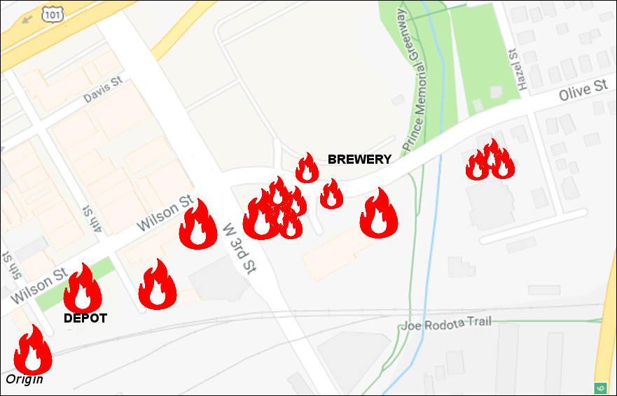 The first riot started around midnight on Sunday, March 26. Some three dozen SF&NP workers were in Santa Rosa that night; this might have been a regular practice for their day off or perhaps they were furloughed because the company was focused on hiring carpenters to build a bridge over Mark West Creek.