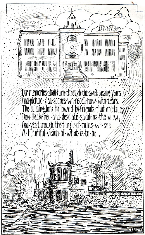 Practically everything else was lost. The school library, consisting of 1000 to 1500 volumes and including many volumes from the city library, was burned. Chemistry and physics equipment valued at $6000 was almost totally destroyed.